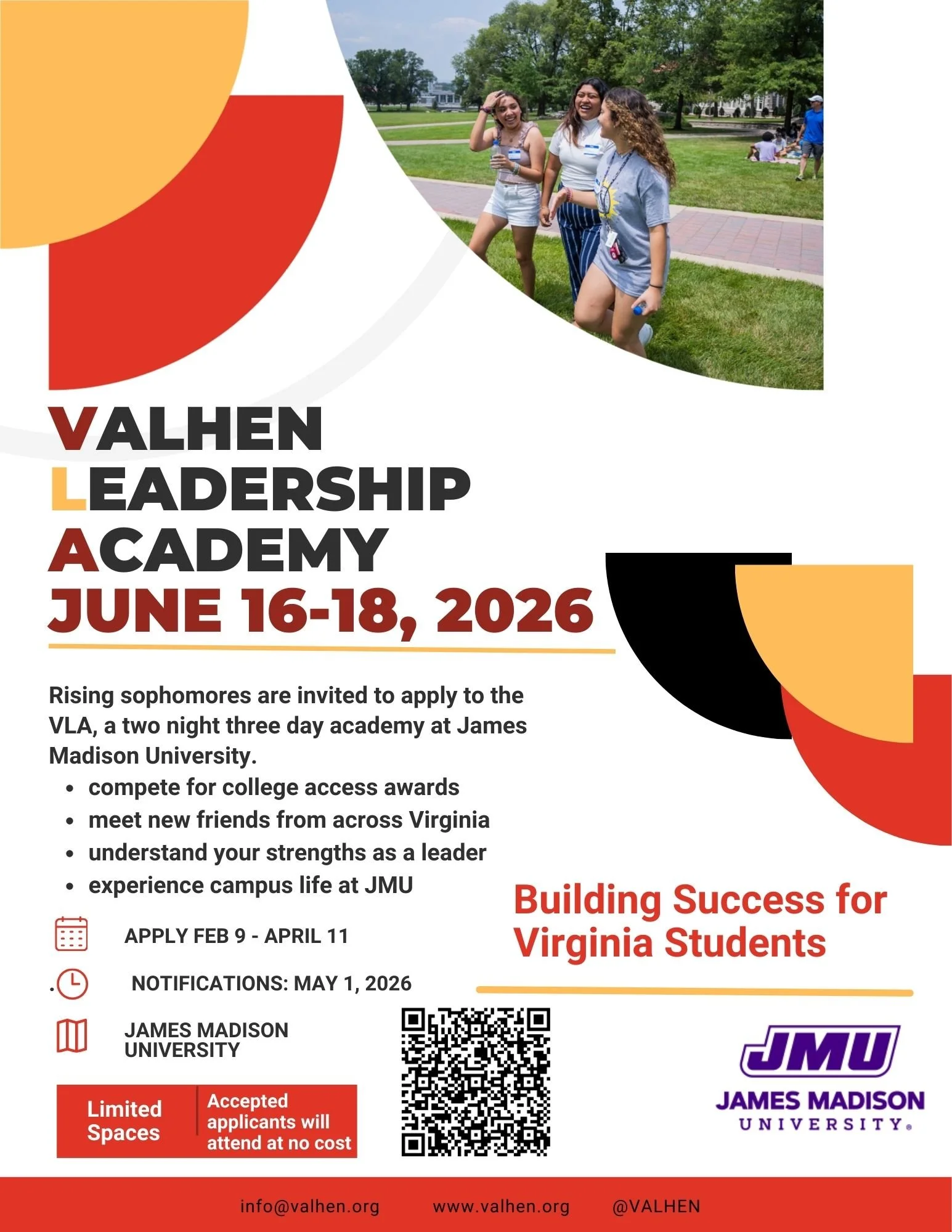 Accepted students will participate in a no-cost two night/three day in person program with workshops on self-awareness, civic engagement, and leadership led by college mentors and university facilitators. Families will be invited to join us in person for a picnic and JMU campus tour on July 25 (transportation will not be provided). For more program information contact the VALHEN LLA Coordinator, llajmu@gmail.com. (click on the brochure below to see example brochure).